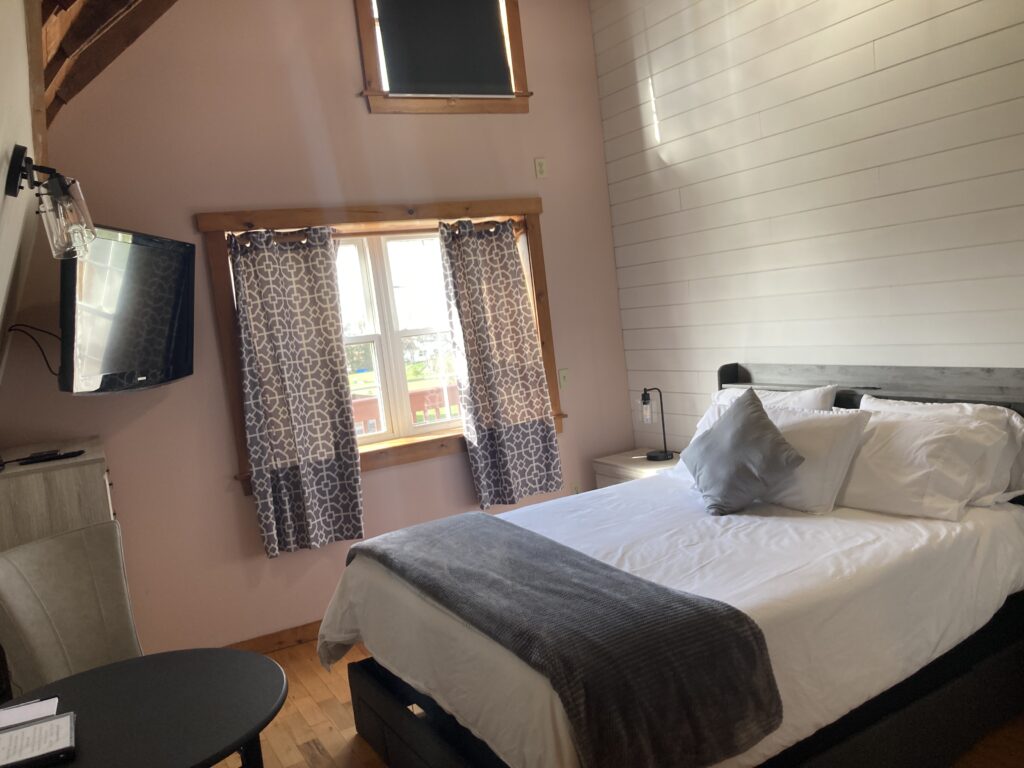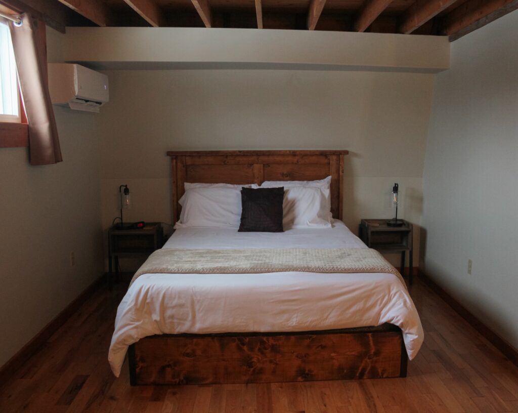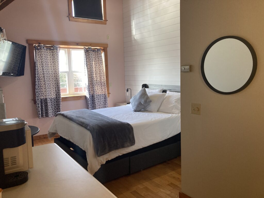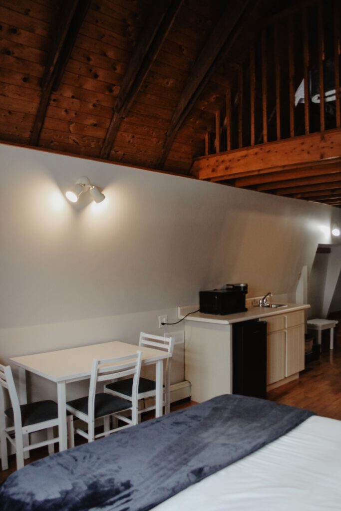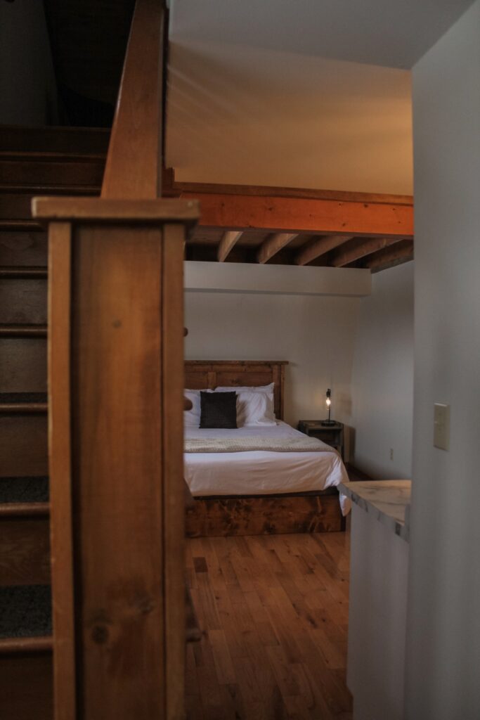 Queen sized bed on the second level of the Inn. There is a sitting area in the loft, kitchenette and full bathroom.