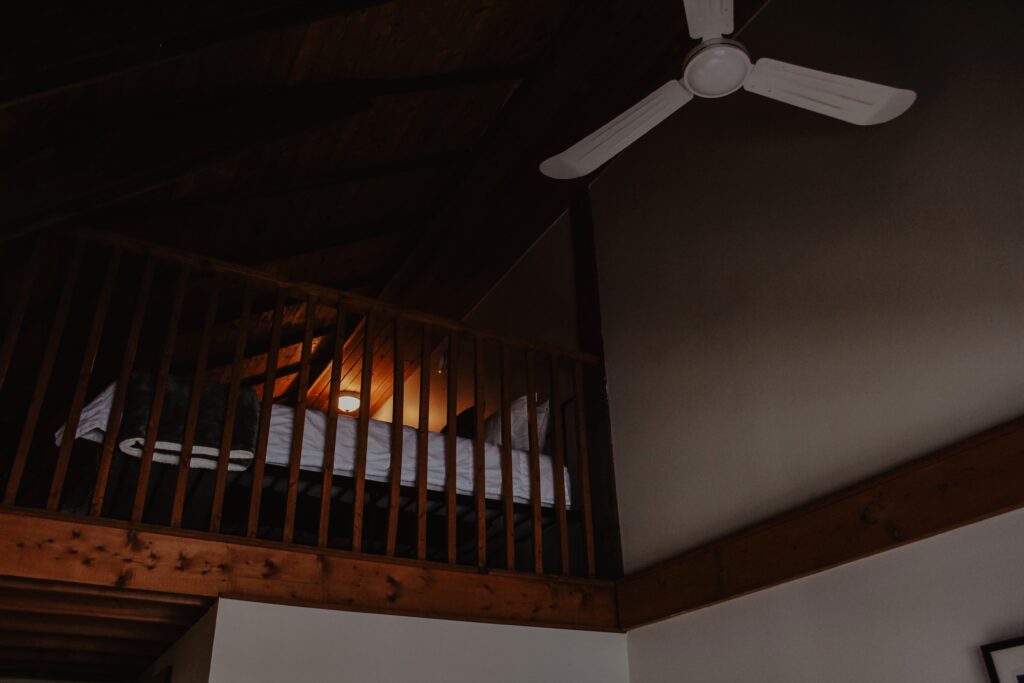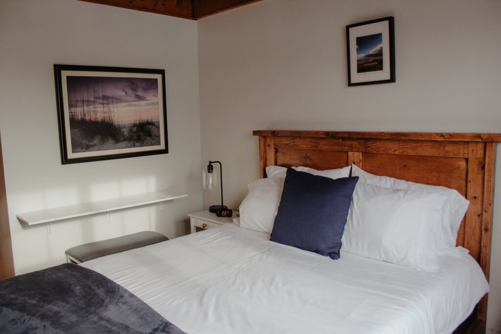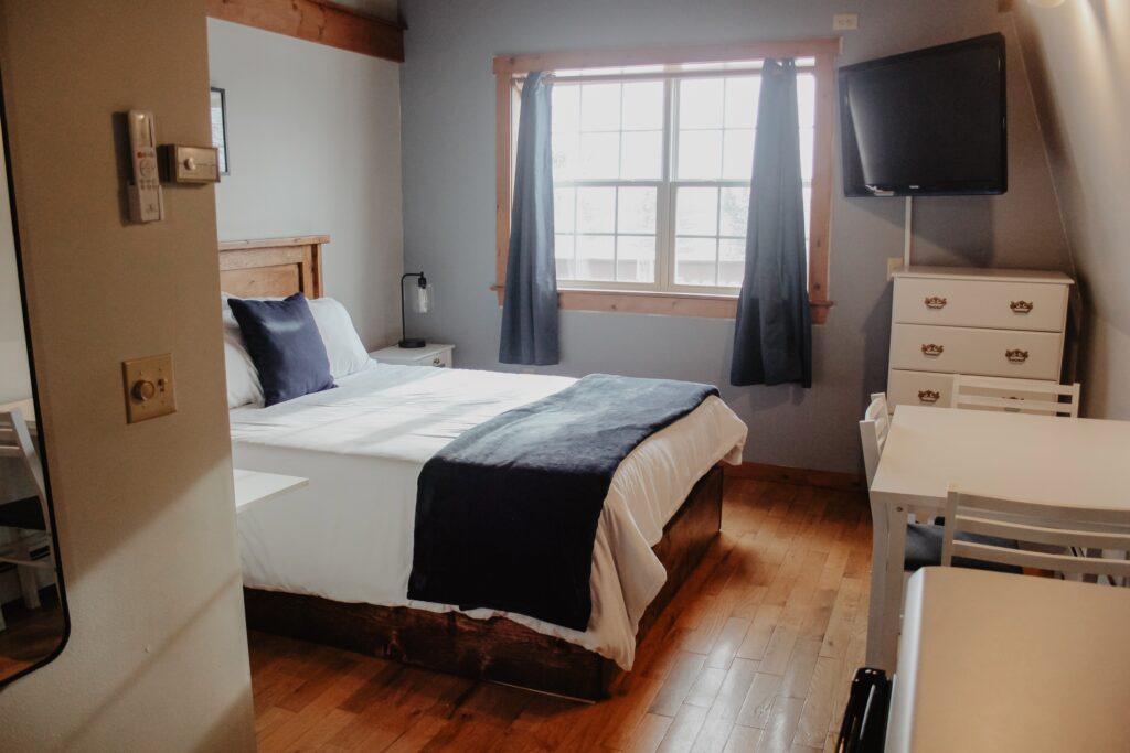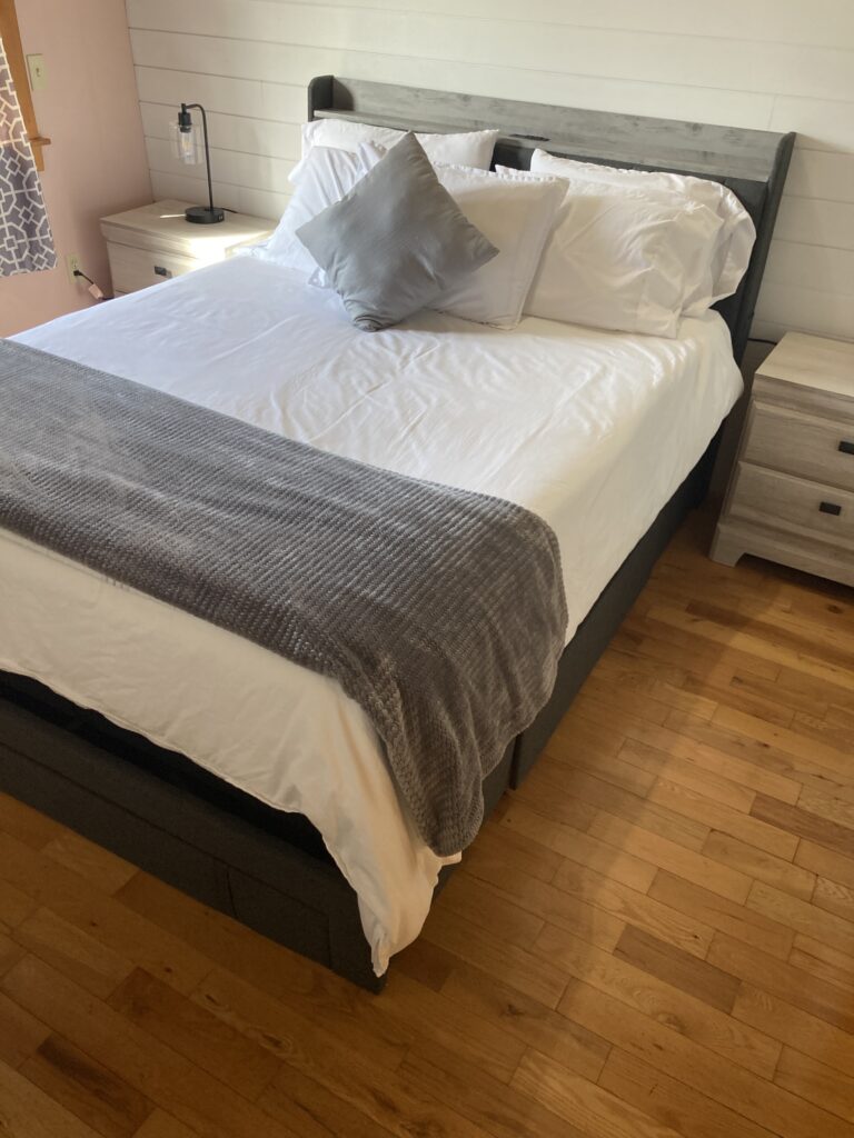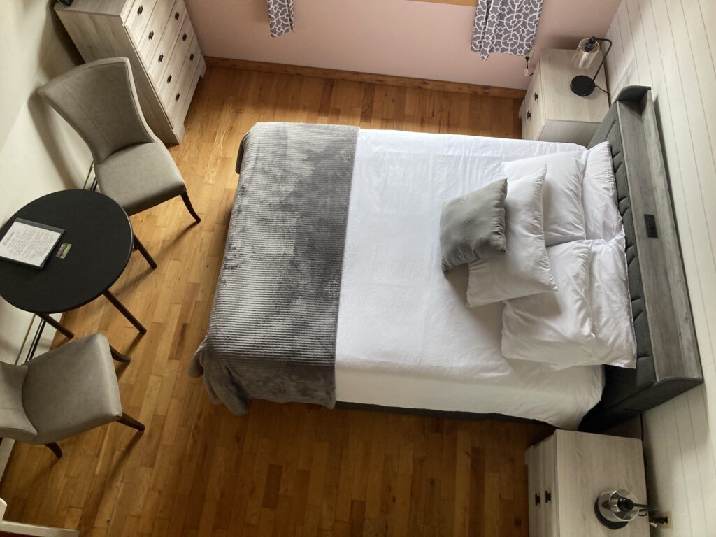 Queen sized bed on the second level of the Inn. There is a sitting area in the loft, kitchenette and full bathroom.
