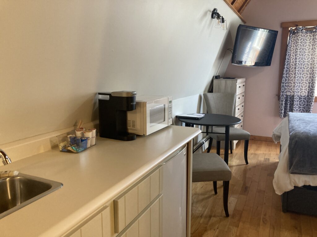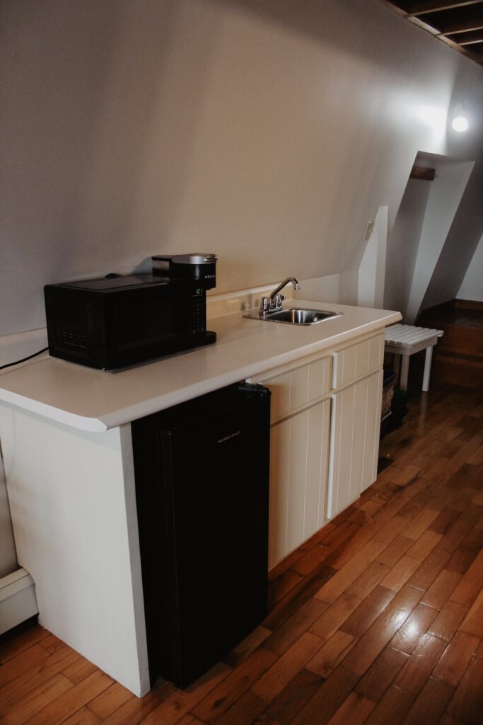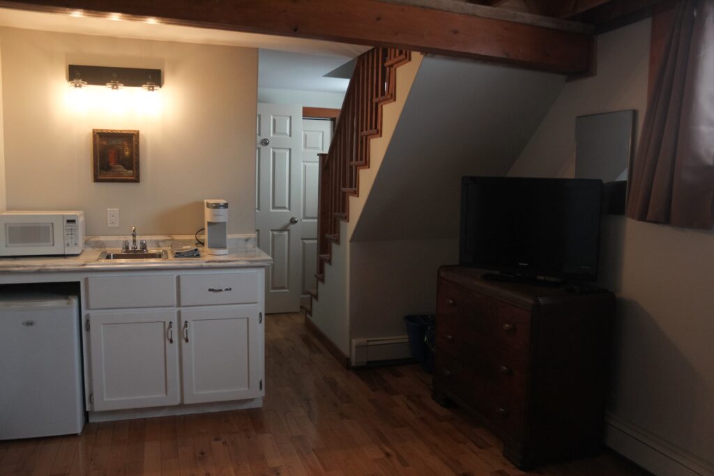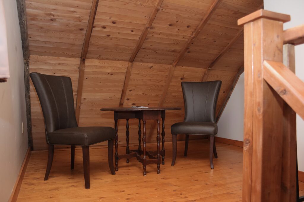 The East Wing has a Queen sized bed on the second level of the inn and two twin beds in the loft. There is a kitchenette and full bathroom.