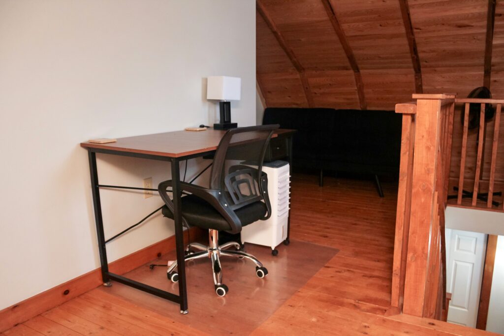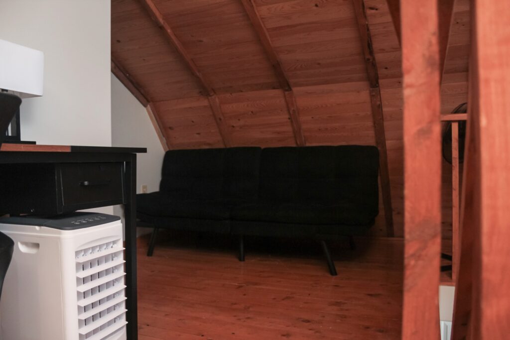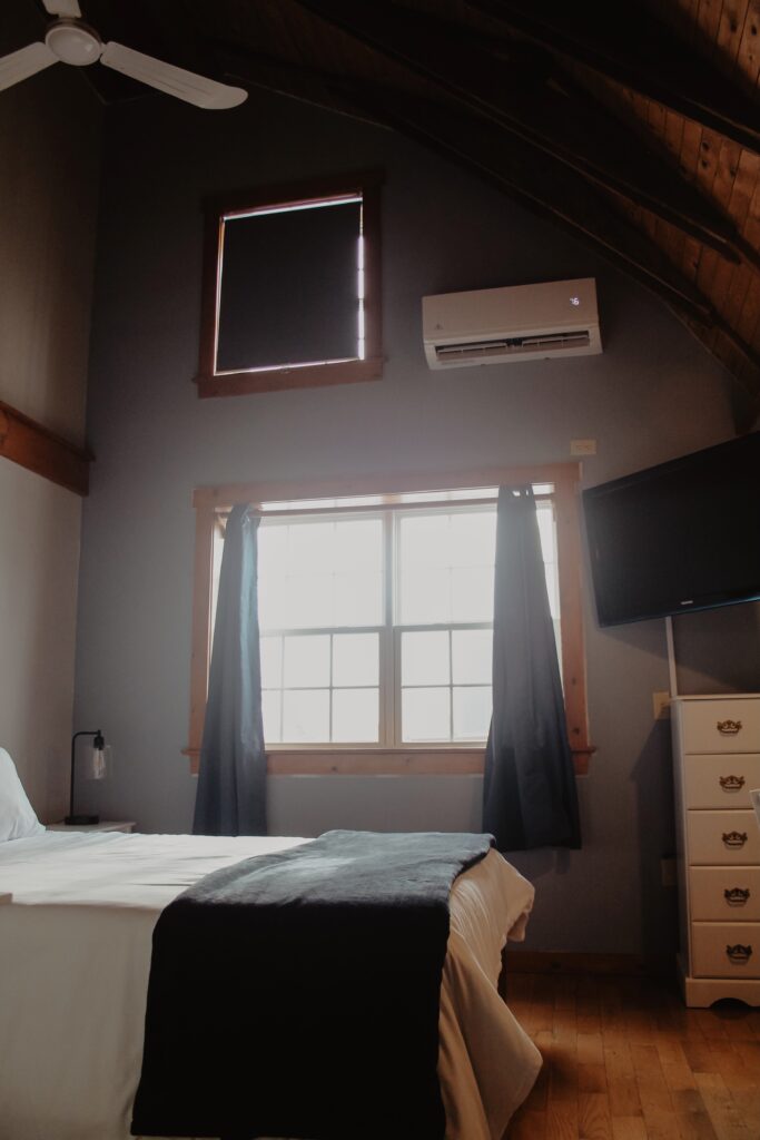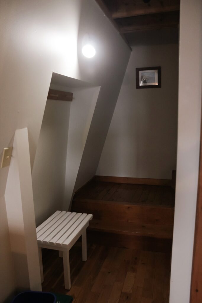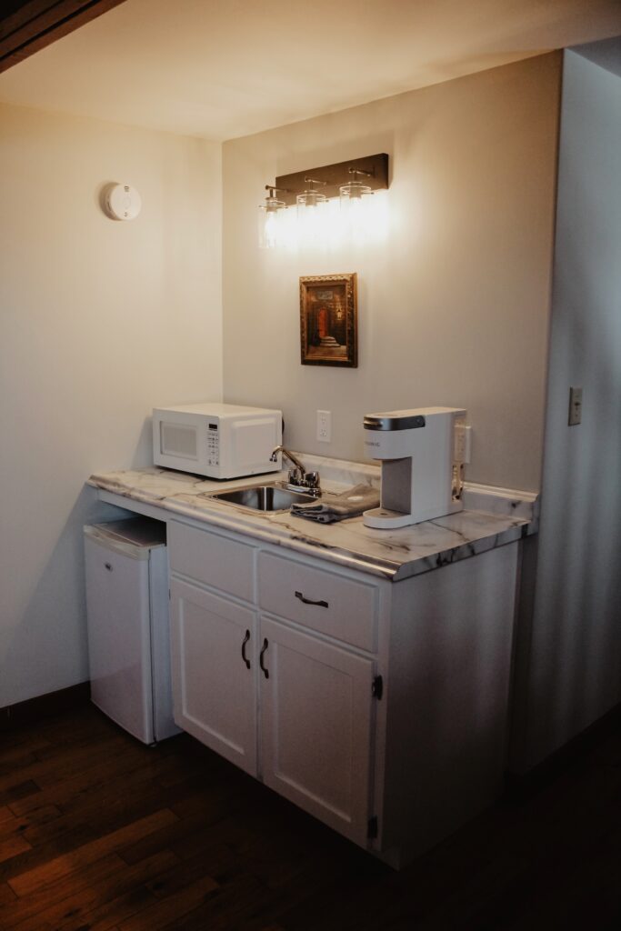 The East Wing has a Queen sized bed on the second level of the inn and two twin beds in the loft. There is a kitchenette and full bathroom.