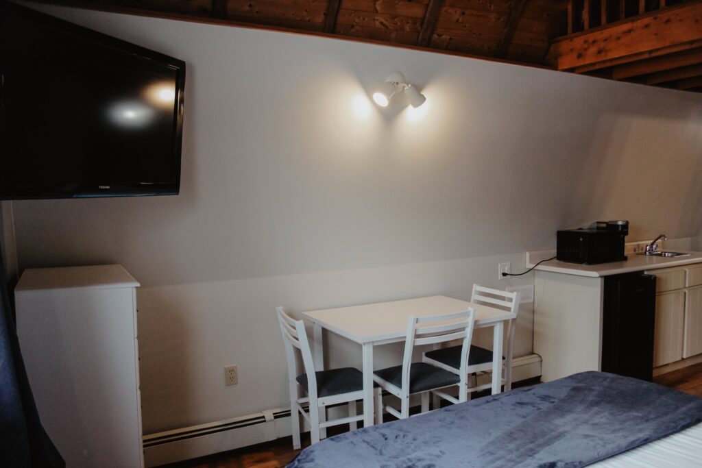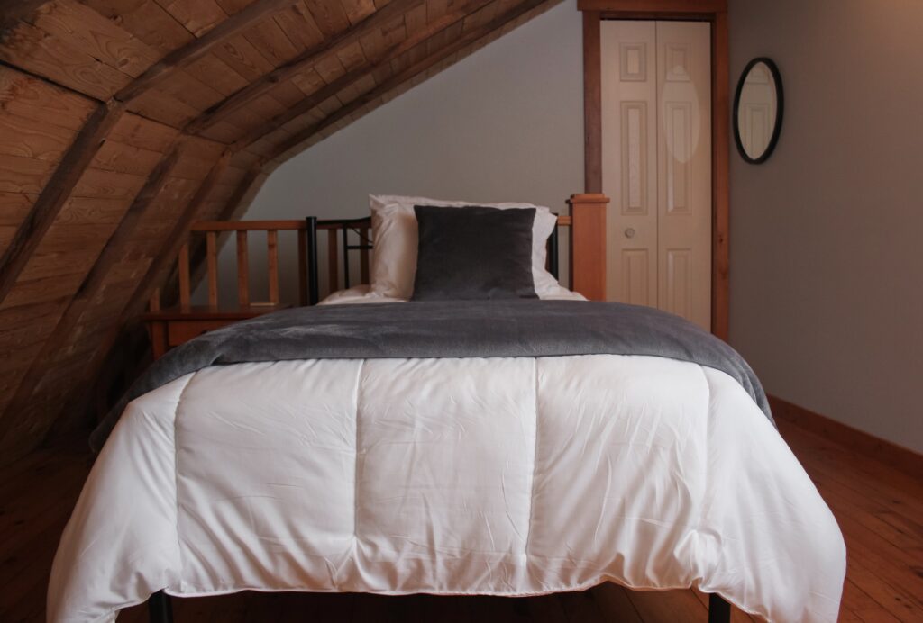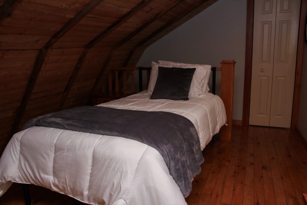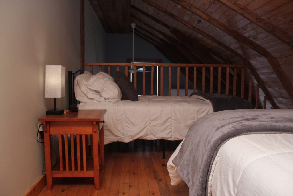 The South Wing has a Queen sized bed on the second level of the inn and two twin beds in the loft. There is a kitchenette and full bathroom.